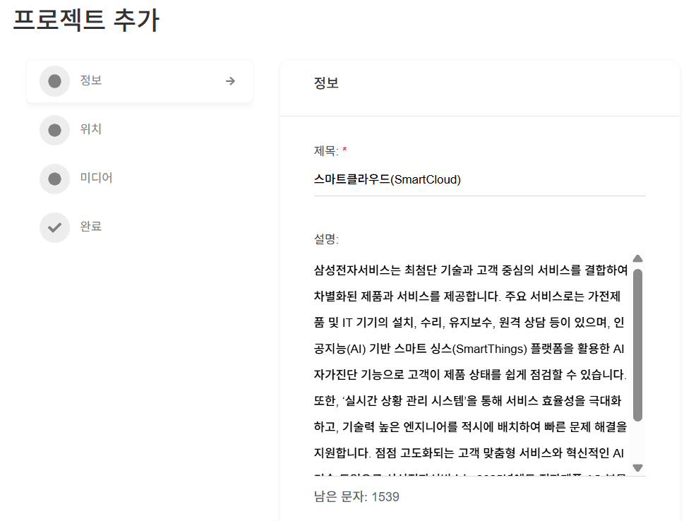 해당 프로젝트의 특장점, 서비스 내용 등 상세 설명을 설명란에 작성합니다.
