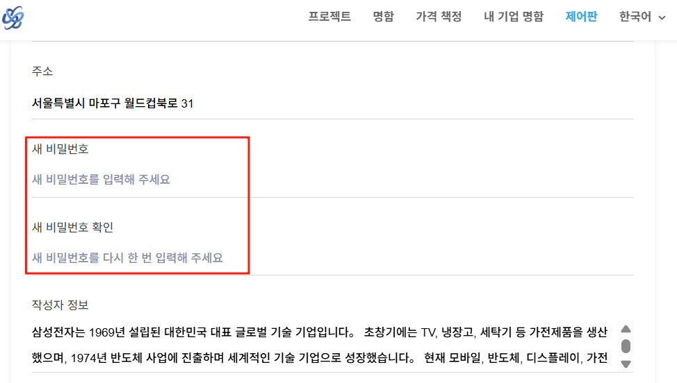 “명함 설정” 메뉴에서 현재 비밀번호를 입력 후, 새 비밀번호로 변경 가능합니다.