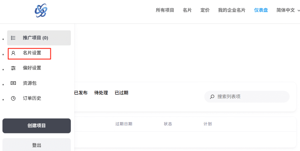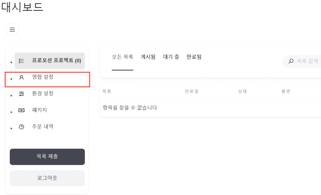 좌측 메뉴에서 “명함 설정”을 클릭해 명함관리 화면에 진입할 수 있습니다.