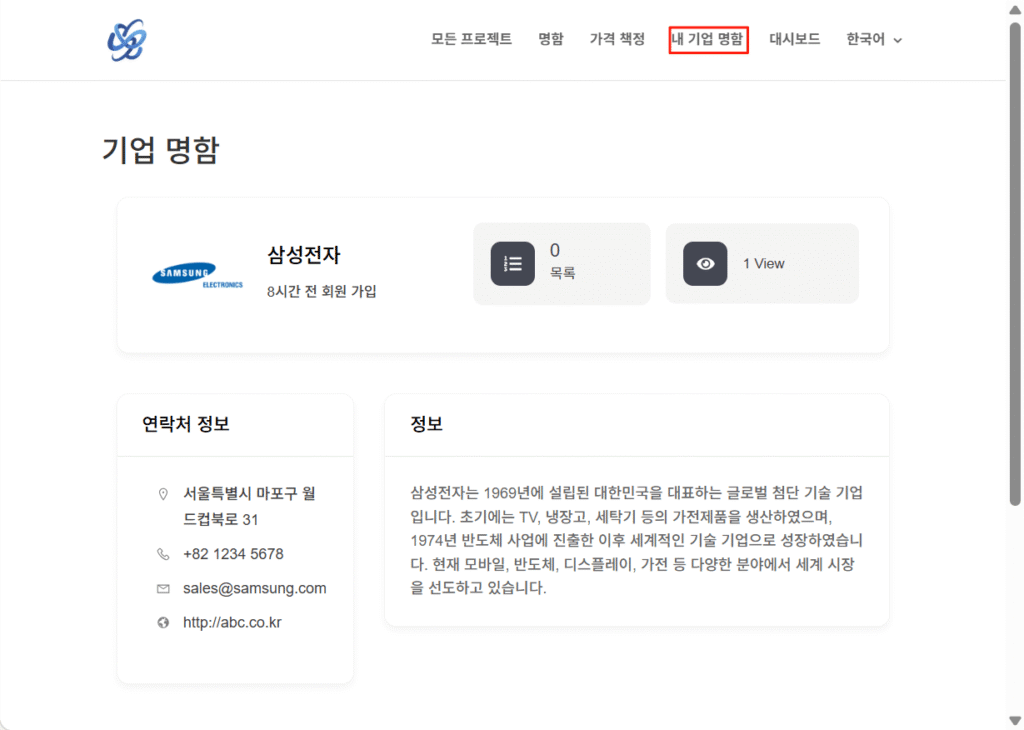 상단 메뉴에서 내 기업 명함을 클릭하면, 본인의 기업 명함 상세 페이지로 이동합니다.