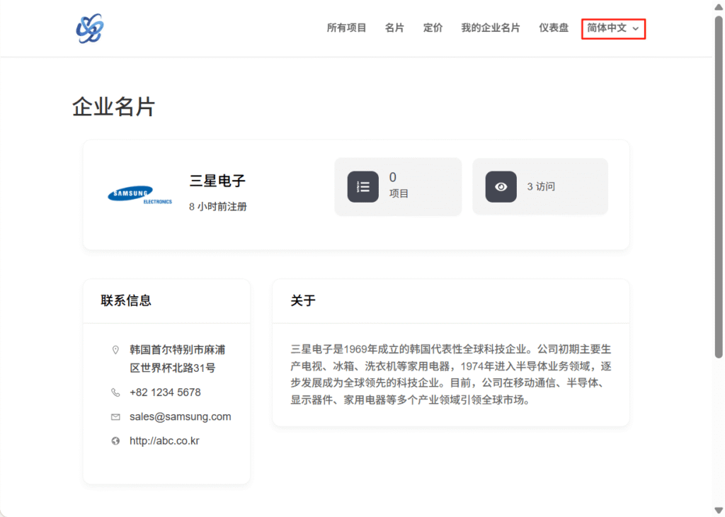 중국어 페이지에서 직접 회사 정보, 연락처, 기업 소개 등의 내용을 수동으로 수정할 수 있습니다.