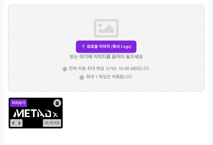 프로필 이미지 (회사 로고) 는 페이지 설정 > 기본 정보 섹션에 있습니다. 최대 1개, 파일 크기 10MB 이하. 최소 200×200픽셀 이상의 정사각형 형식을 권장합니다.