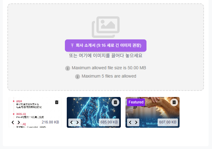 회사 소개서는 프로필 — 신뢰도 & 설득력 UP 섹션에 있습니다. 최대 5개, 파일 크기 각 10MB 이하. 다음과 같은 이미지를 활용하면 중국 바이어에게 효과적입니다.