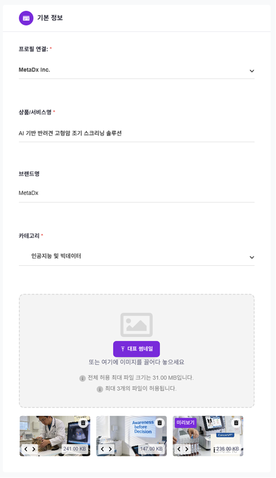 대표 썸네일: 카탈로그 목록 및 공유 카드에 표시될 대표 이미지를 업로드합니다. 파일을 선택하거나 업로드 영역으로 끌어다 놓으면 됩니다. 최대 3개 파일, 전체 합산 31MB 이하로 업로드할 수 있습니다