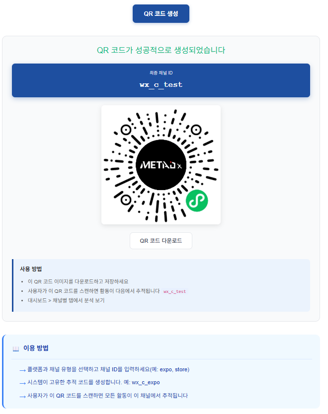 화면에 최종 채널 ID(예: wx_c_expo1)와 QR 코드 이미지가 표시됩니다. QR 코드 다운로드를 클릭하여 이미지를 저장합니다.