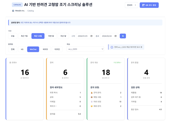 바이어가 QR 코드를 스캔하면 페이지 조회, 문의 등 모든 활동이 해당 최종 채널 ID로 자동 집계됩니다. [데이터 대시보드] → [채널별] 탭에서 채널 ID별 유입 통계를 확인할 수 있습니다