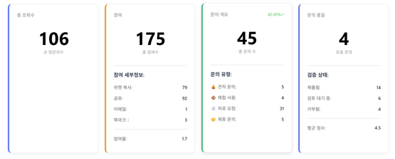 대시보드 상단의 KPI 카드는 선택된 기간 내 주요 성과 지표를 요약하여 보여줍니다