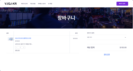 [지갑 충전] 버튼을 클릭하여 크레딧을 충전합니다. USD로 결제하며, 환율은 실시간 적용됩니다. 충전 완료 후 장바구니에서 최종 결제를 진행합니다.